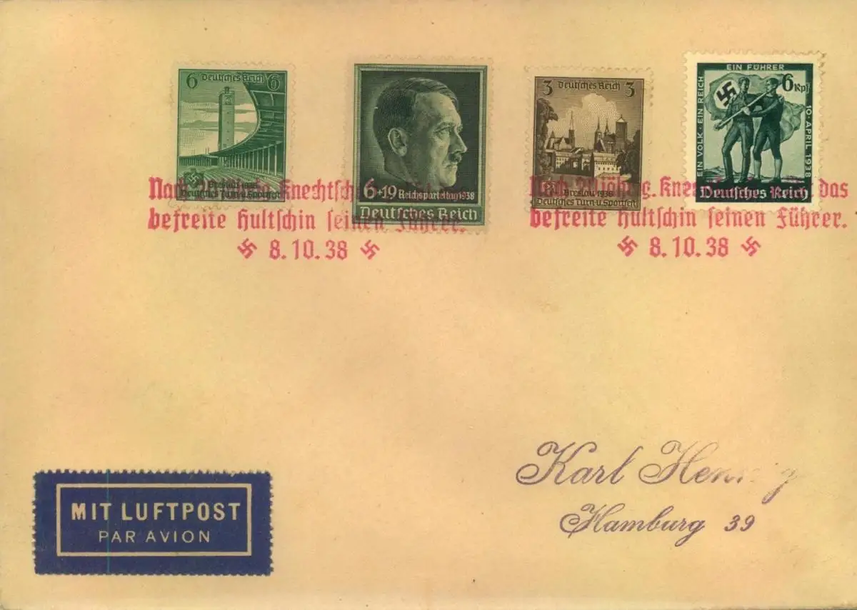 1938, Luftpostbrief mit Befreiungsstempel HULTSCHIN