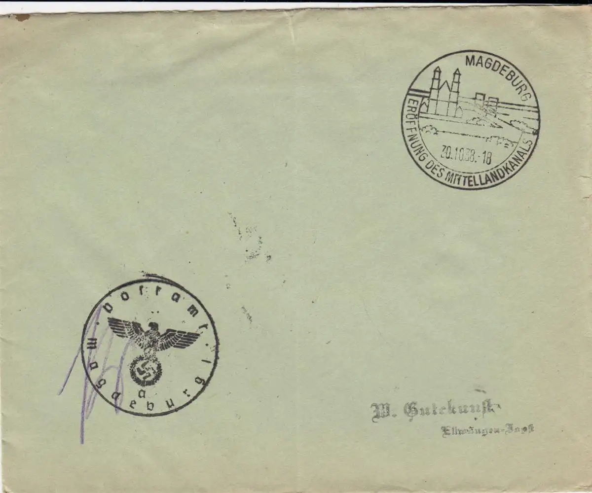 1938: Sonderstempel Magedburg Eröffnung Mittellandkanal als Postsache