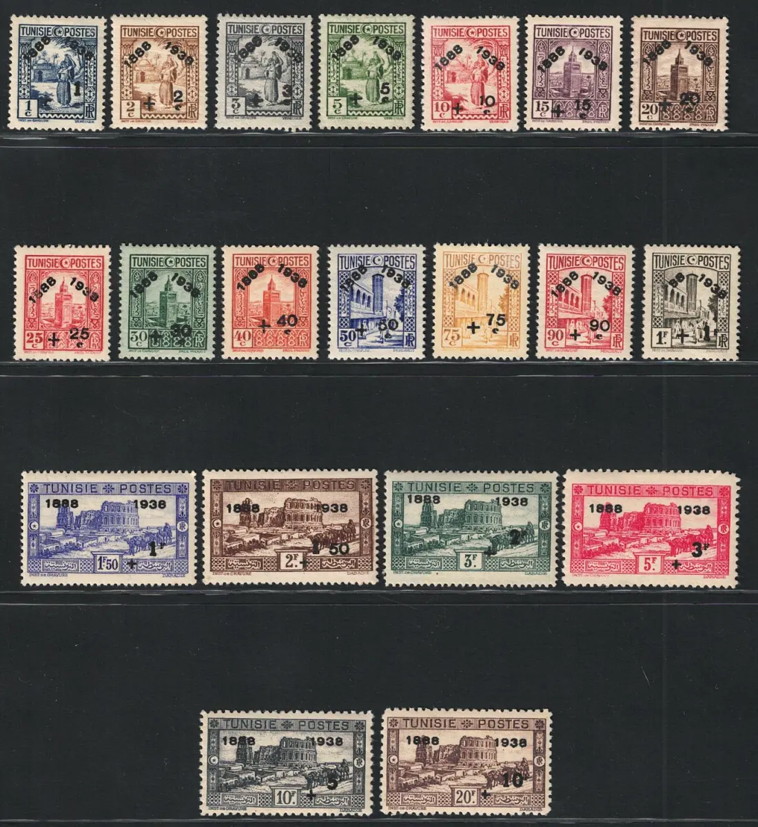 1938 Tunesien, Yvert # 185/204, Hundertjahrfeier Tunesisches Postamt, postfrisch **