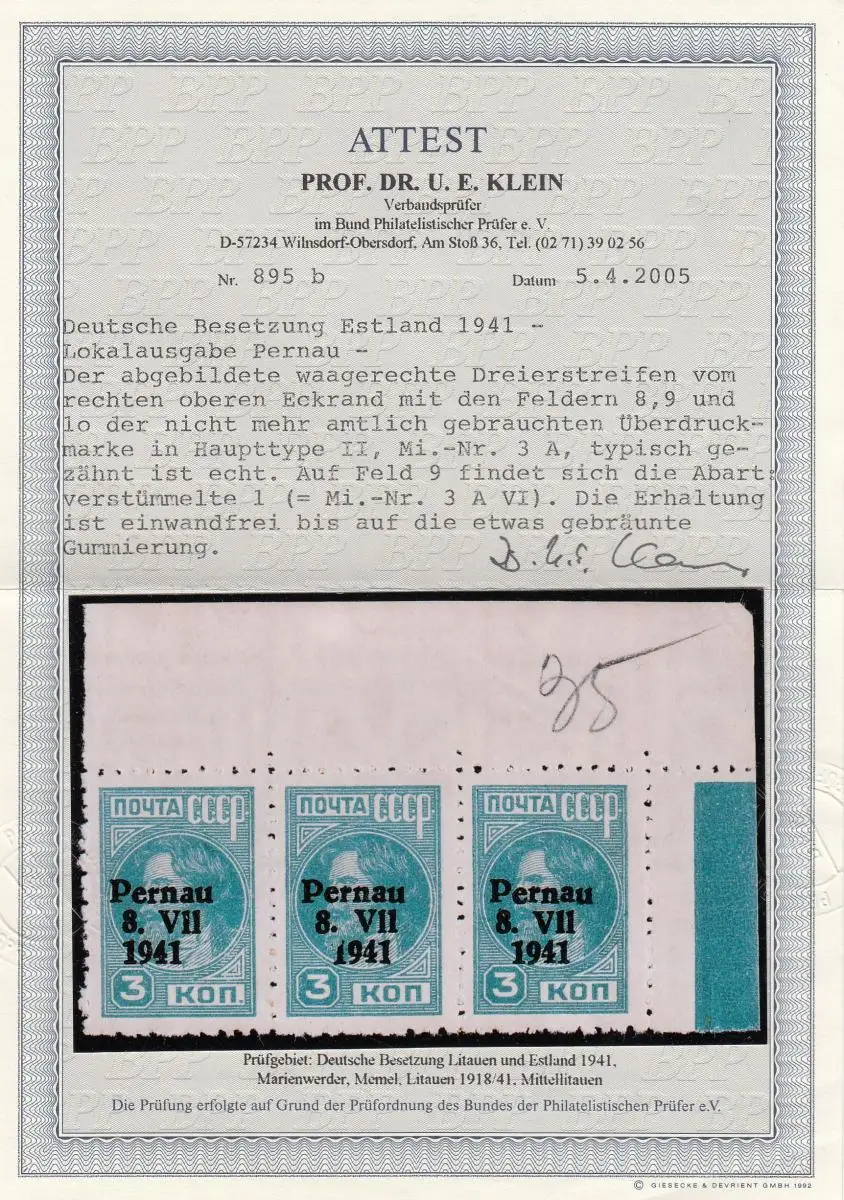 1941: MiNr. 3A Aufduck II, Plattenfehler 3 A VI, Eckrandstreifen BPP Attest
