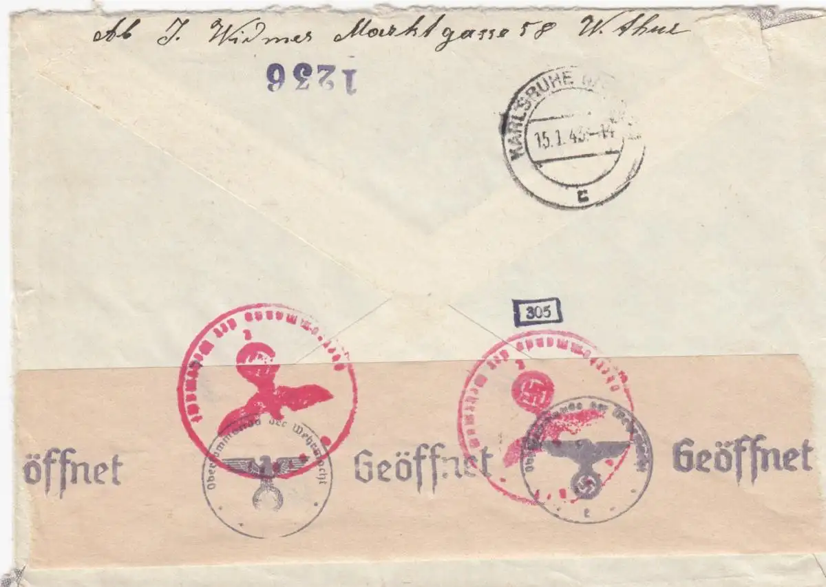 1943: Einschreiben Winterthur nach Karlsruhe, Zensur