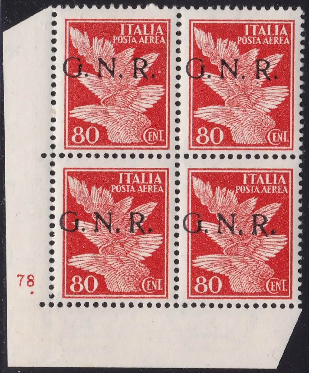 1944 RSI, Luftpost - Nr. 120 - 80 Cent. orange MNH ** 4ER BLOCK MIT TISCHNUMMER Signatur Olive/Chiavarello