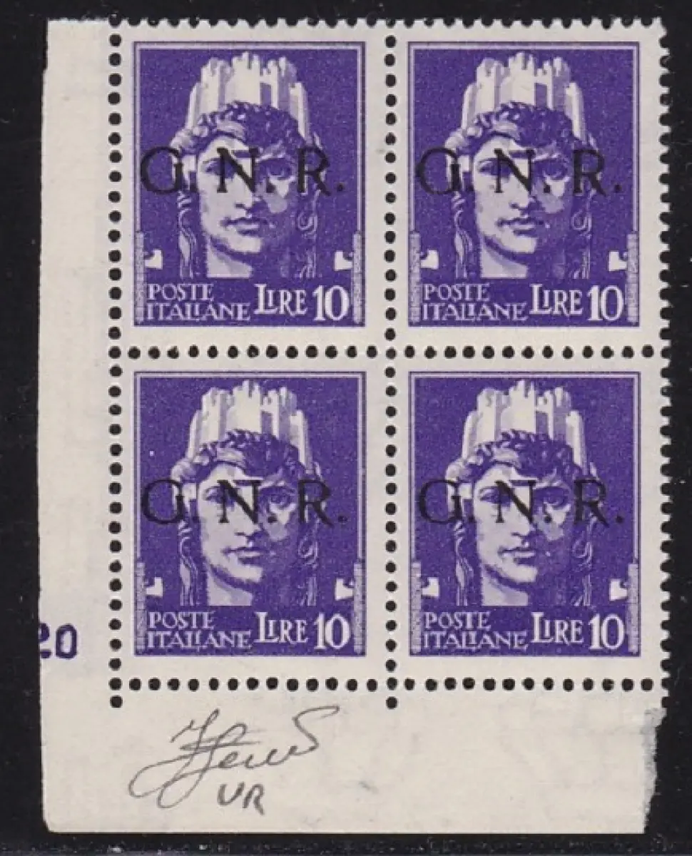 1944 Italienische Sozialrepublik, Nr. 486 10 Lire violett MNH / ** VIERTEL MIT TISCHNUMMER Signiert Olive Zertifikat Eisen SACHSEN Katalog Euro 2.400 + + Lot 83