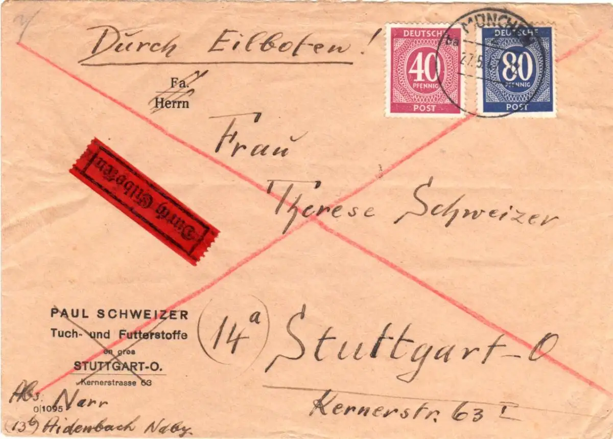 1947, 40+80 Pf. auf portorichtigem Eilboten Brief v. München n. Stuttgart