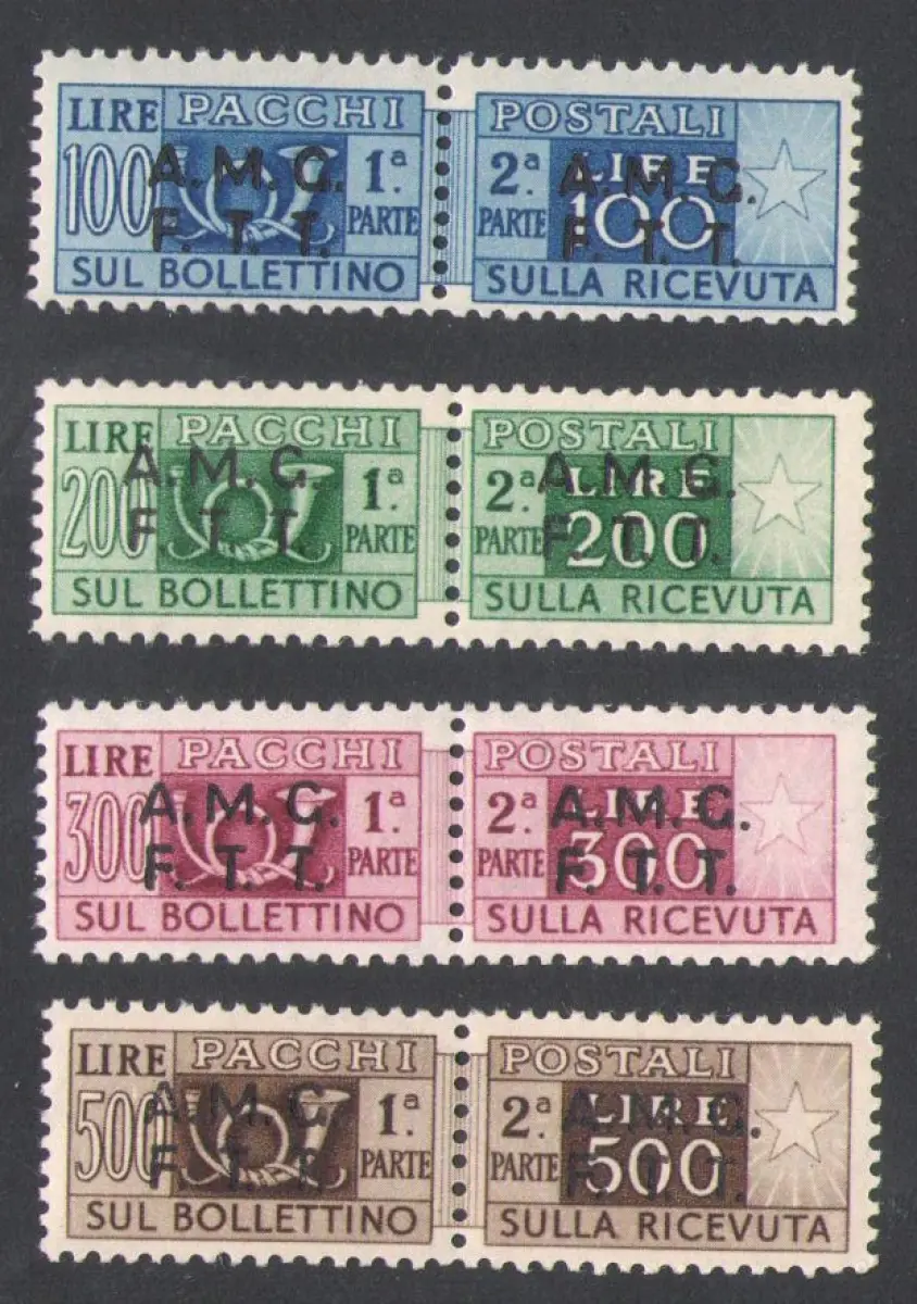 1947-48 TRIEST A - Postpakete mit zweizeiligem Aufdruck MNH/** komplette Serie, hohe Werte wie gescannt auf der Rückseite signiert, von Raybaudi und Alberto Diena, sehr schön frisch und zentriert.