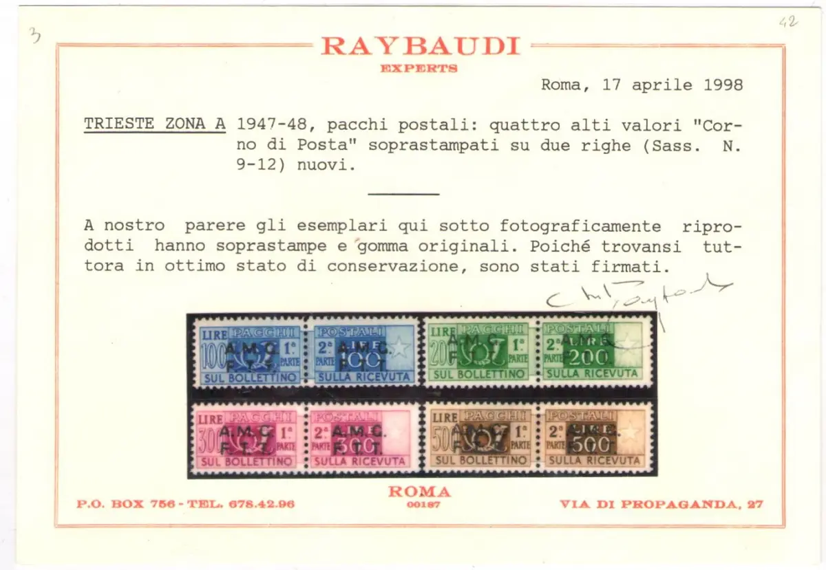1947-48 TRIEST A - POSTPAKETE - Die komplette Serie Nr. 1/12 Raybaudi Zertifikat