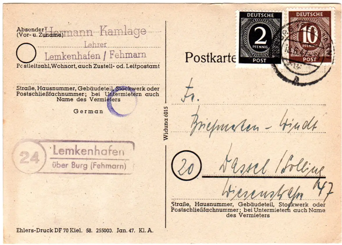 1947, Landpost Stpl. 24 LEMKENHAFEN über Burg (Fehmarn) auf Karte m. 2+10 Pf.