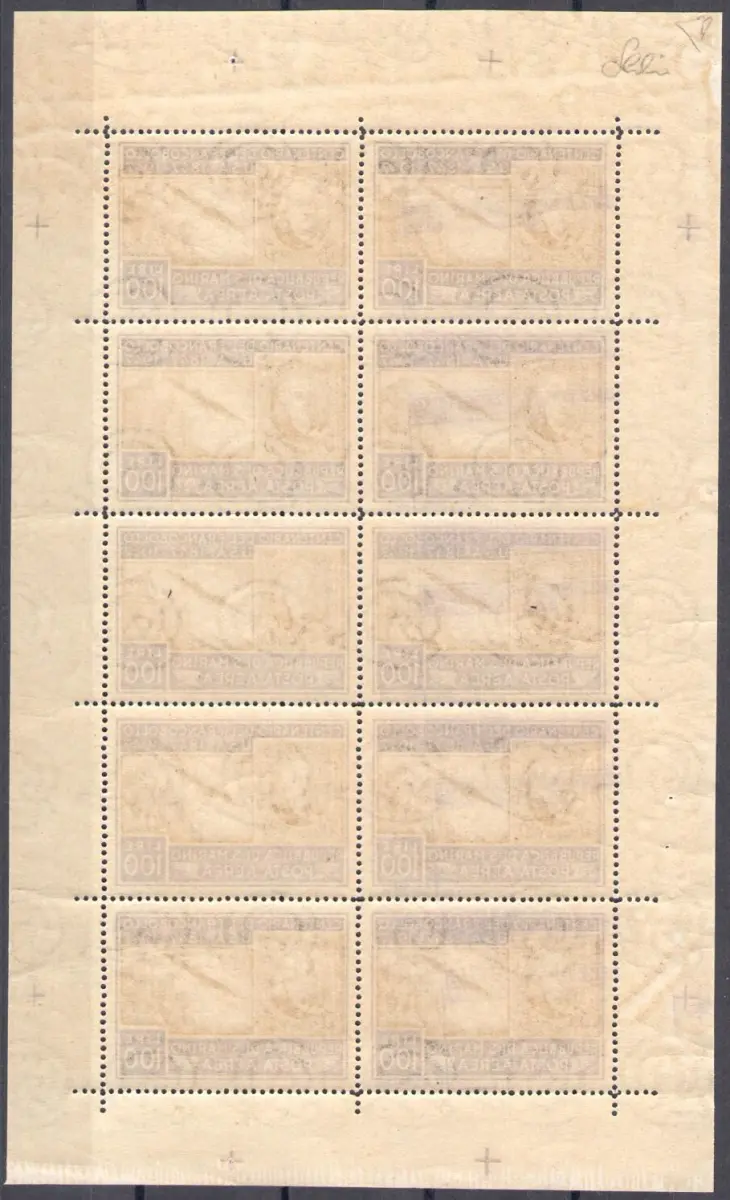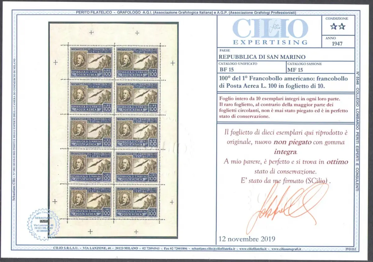 1947 SAN MARINO, Amerikanisches Kleinblatt, Nr. 15 - Signiert Enzo Diena - Wunderschön ohne Falten - MNH ** Zertifikat Chilio - NIE GEFALTET Sächsischer Katalog, Euro 4250 Lot 1 / ACAT RSM SCHWARZ
