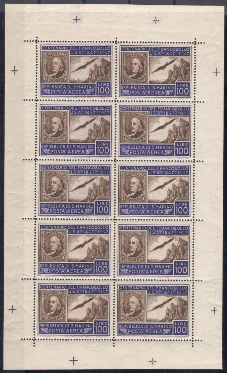 1947 SAN MARINO, Amerikanisches Kleinblatt, Nr. 15 - Signiert Enzo Diena - Wunderschön ohne Falten - MNH ** Zertifikat Chilio - NIE GEFALTET Sächsischer Katalog, Euro 4250 Lot 1 / ACAT RSM SCHWARZ