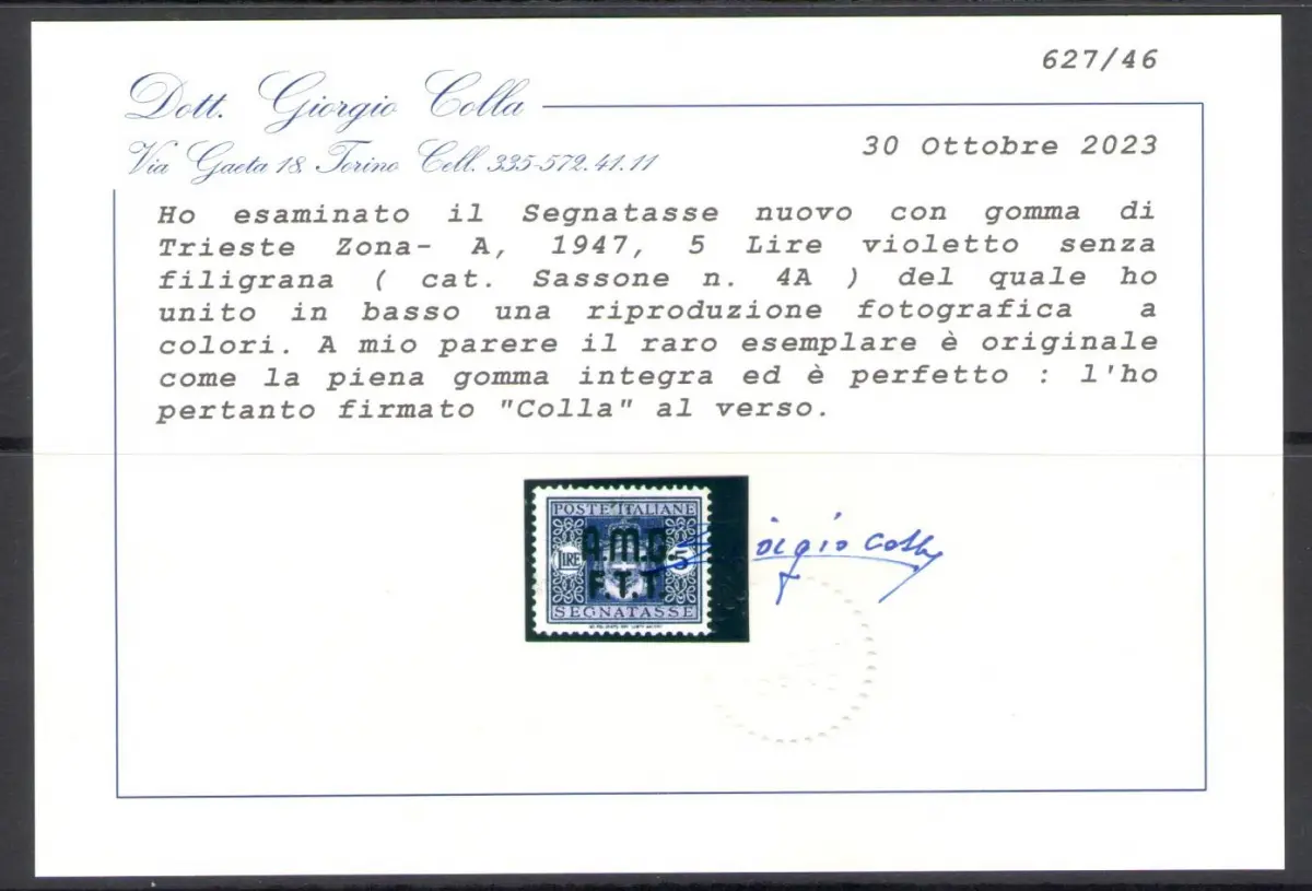 1947 TRIEST A, Steuermarken 5 Lire violett ohne Wasserzeichen, postfrisch** - Hervorragende Qualität und Zentrierung - Zertifikat Giorgio Colla Sächsischer Katalog Euro 19500