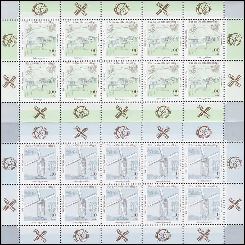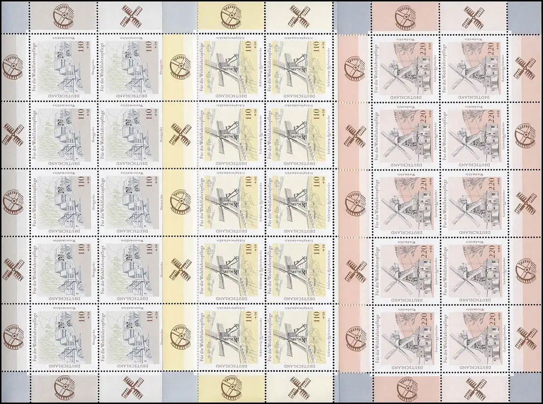 1948-1952 Wofa Wassermühlen / Windmühlen, 5 Werte komplett, 10er-Bogen-Satz, **