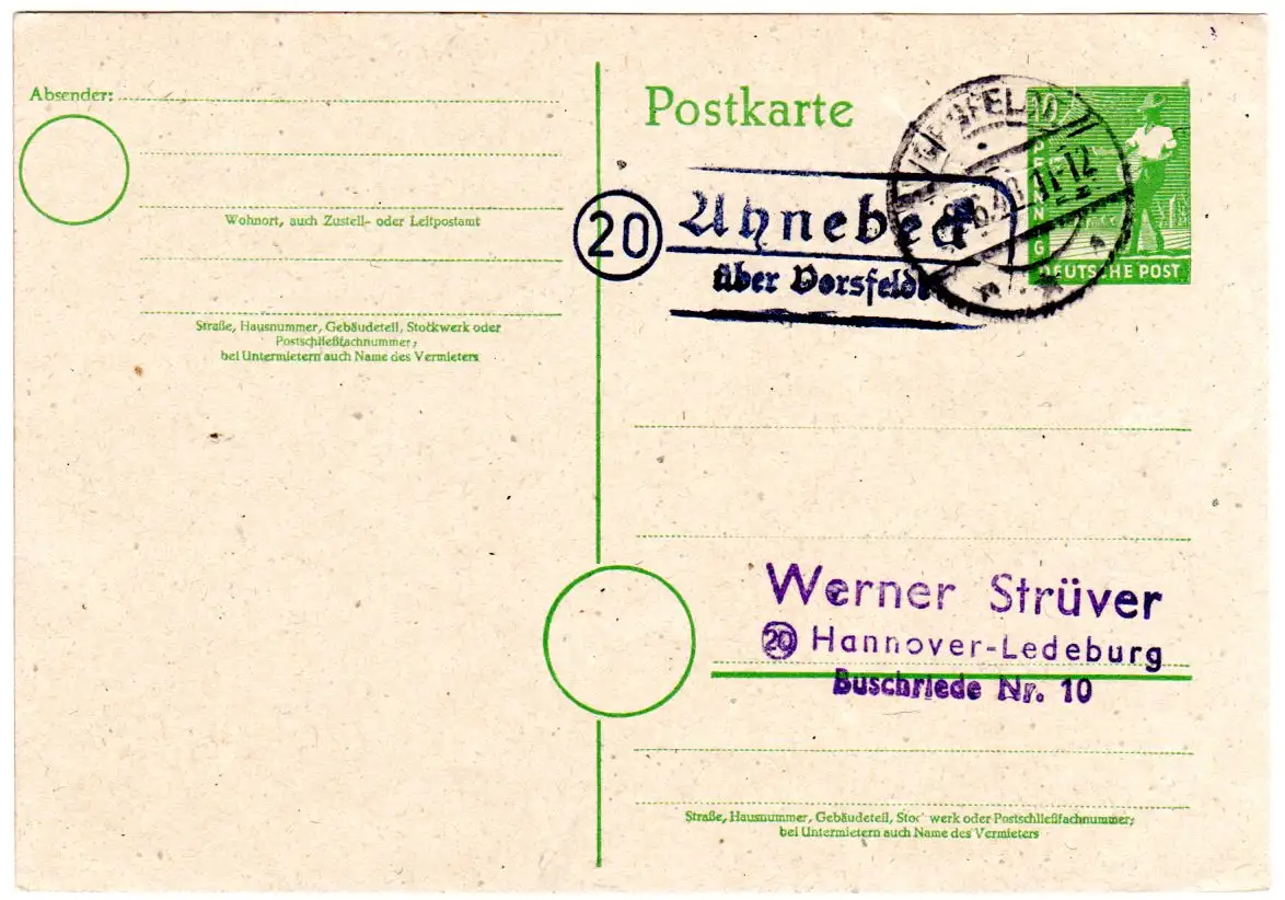 1948, Landpoststpl. 20 AHNEBECK über Vorsfelde auf 10 Pf. Ganzsache.