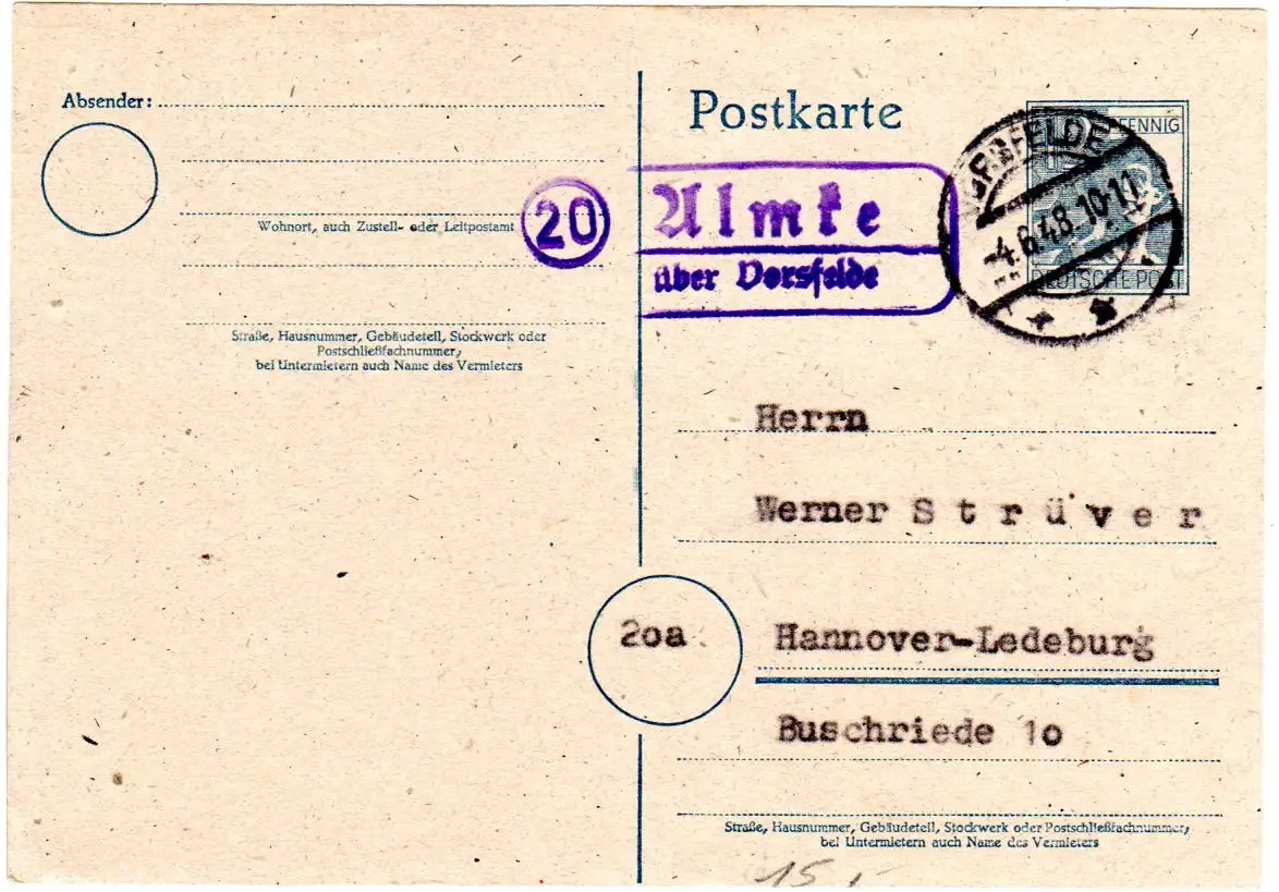 1948, Landpoststpl. 20 ALMKE über Vorsfelde auf 12 Pf. Ganzsache