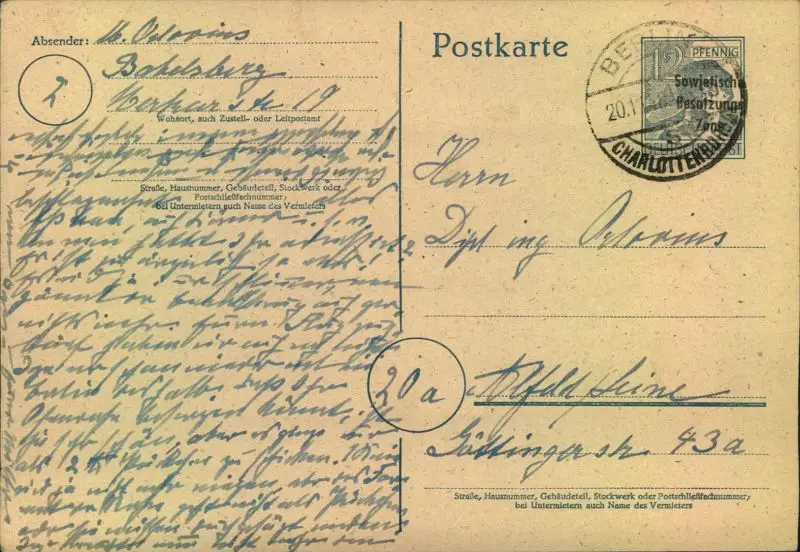 1948, Postkarte mit 12 Pfg. AS Werstempel mit verschobenem Aufdruck ab BERLIN-CHARLOTTENBURG 4 mit Ost-Absender.