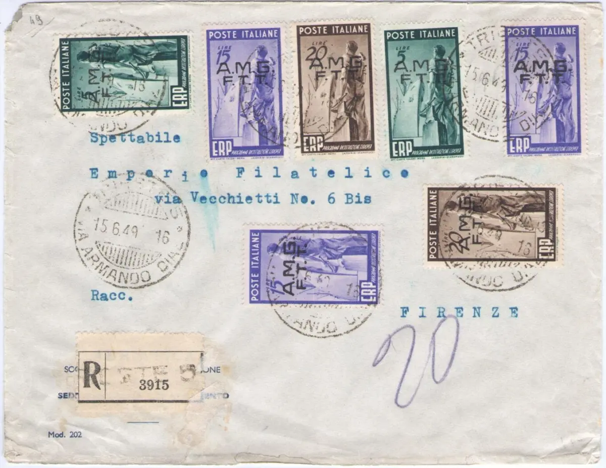 1949 TRIEST A - 2 x ERP-Serie - 05.06.1949 Einschreiben nach Florenz, Erstausgabetag - Seltener Sächsischer Katalog Euro 800 LOT 30 Box Umschläge Venedig Triest