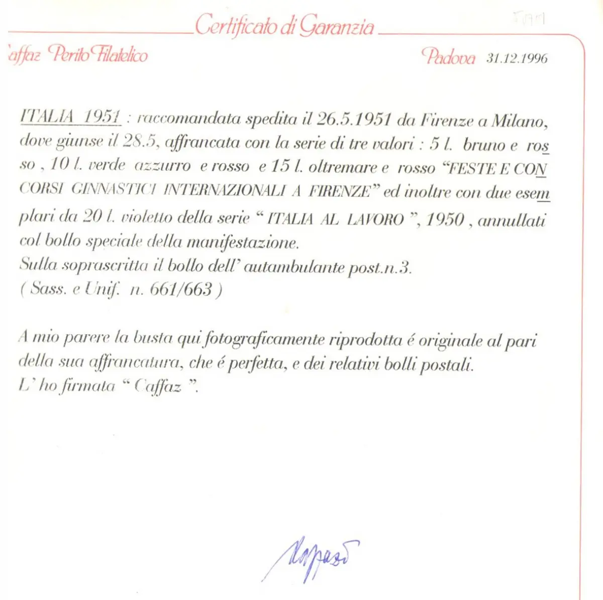 1951 Republik, Gymnasien auf Umschlag, Einschreiben am 26.5.1951 von Florenz nach Mailand gereist - Caffaz-Zertifikat - Selten - Frankiert mit der Serie von 3 Werten der Turnspiele und zusätzlich mit 2 Exemplaren von 20 Lire der Serie Italia al Lavoro von 1950, die ebenfalls mit dem Sonderstempel der Veranstaltung storniert wurden.
