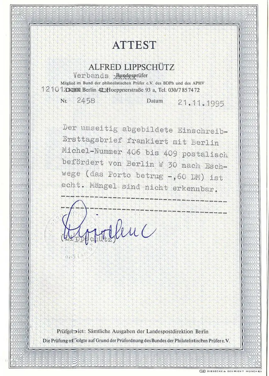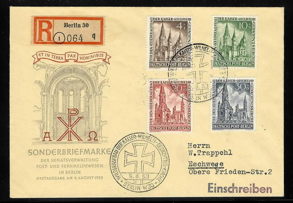 1953 Wiederaufbau Kaiser-Wilhelm-Gedächtniskirche MiNr.106-109 FDC, BPP Attest