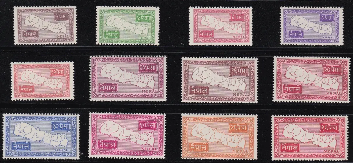 1954 NEPAL, Stanley Gibbons n. 85/96 12 Werte MLH/* LINGUELLATIMap of NepalKatalog SG L 225