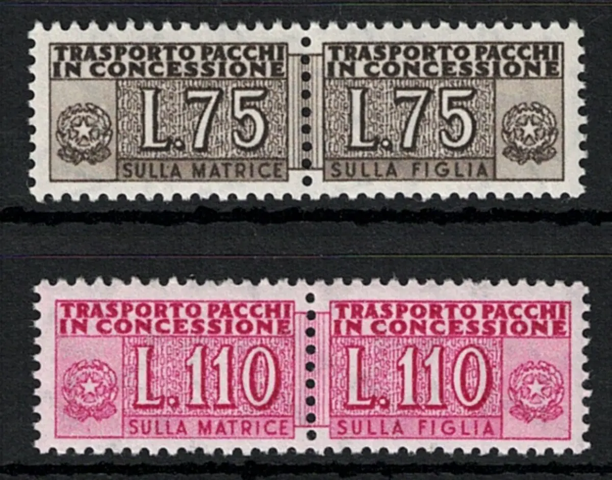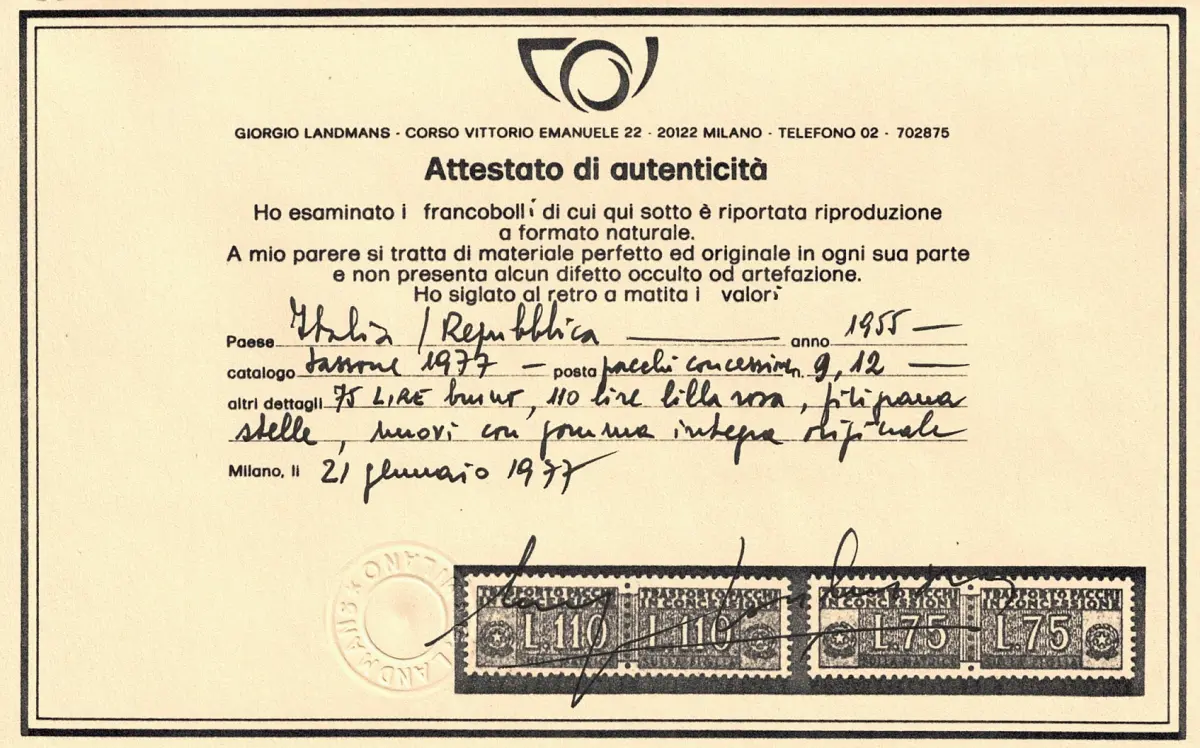 1955 Italien - Pakete in Konzession, filigrane Sterne 2 Werte Nr. 11-12 - MNH ** Sehr gute Zentrierung, sehr frisch und Garantiezertifikat Landmans (Mailänder Händler) Sächsischer Katalog 2021 Euro 740 - braunes Servicealbum