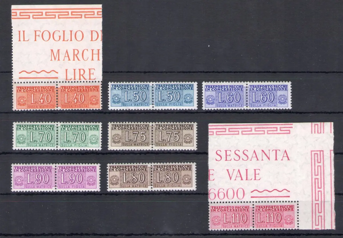 1955 Italien - Republik, Pakete in Konzession, Wasserzeichen Sterne 8 Werte, Serie Nr. 5/8 + 9/10 + 12 + 15, diskrete Zentrierung - MNH **