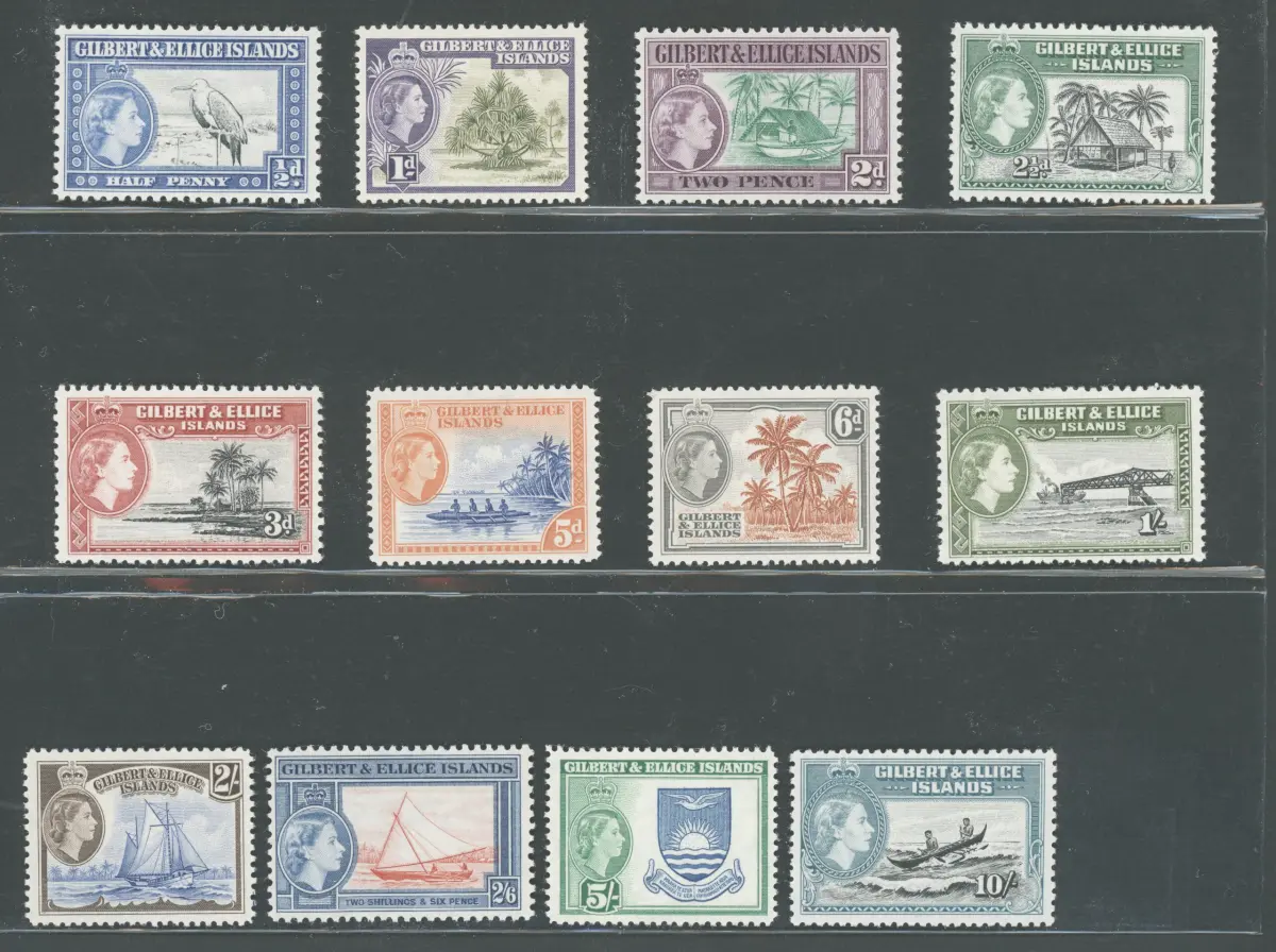 1956-62 Gilbert & Ellice Islands, Stanley Gibbons Nr. 64-75, 12 Werte Serie, MNH ** Stanley Gibbons Katalog 2022 80 - Lot 301-3