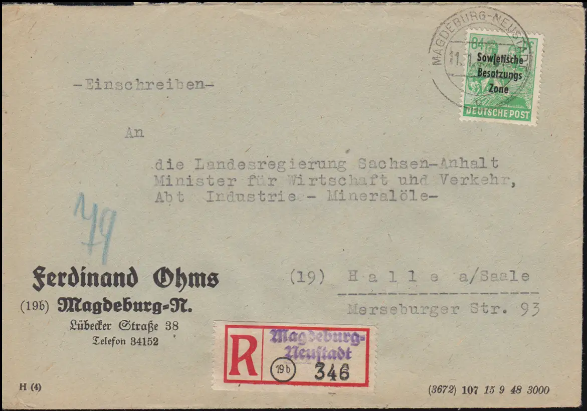 197 SBZ-Aufdruck EF auf R-Brief Not-R-Zettel MAGDEBURG-NEUSTADT 11.1.1949