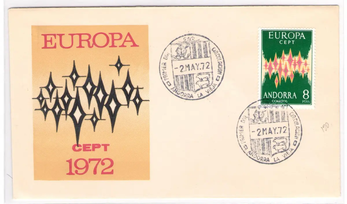 1972 SPANISCHES ANDORRA, Nr. 64A Gebraucht auf nicht gereistem Europa 8p Umschlag. grün und polychrom, 1 Wert Einheitskatalog Euro Box Umschläge Venedig