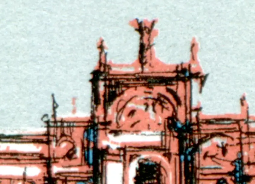 Kleinbogen mit MICHEL-Plattenfehler I: zusätzliche braune Statue links neben dem mittleren Turm.