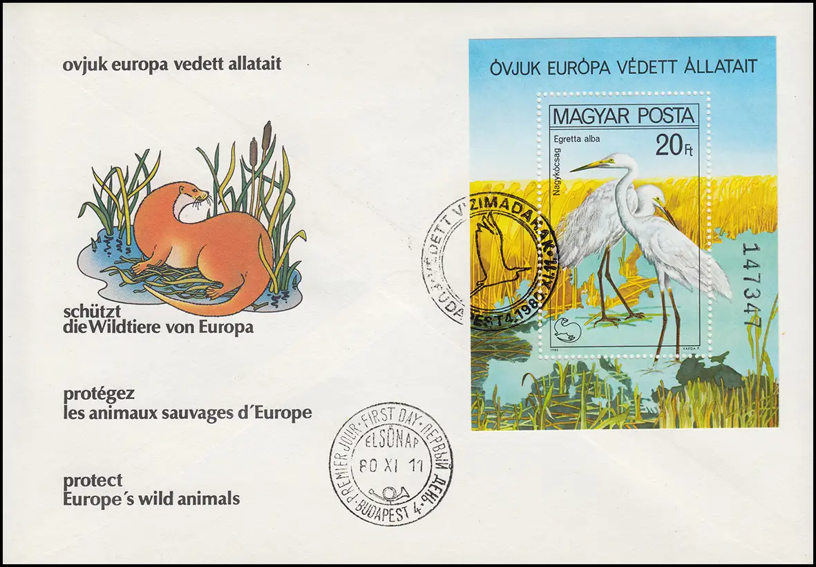 1980 Ungarn 3457 Block 146A Naturschutzjahr Silberreiher, gezähnt auf FDC