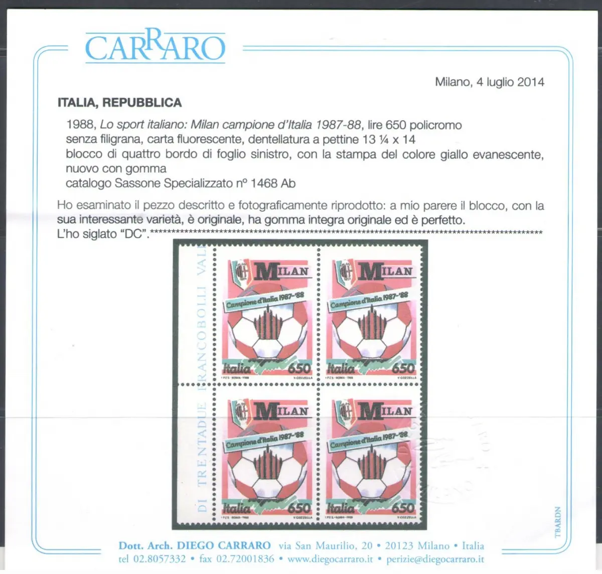1988 Italia, Milan Giallo Evanescente, n. 1854Ab, MNH** Einheitskatalog Euro Album Sorten