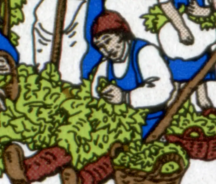 Kleinbogen mit MICHEL-Plattenfehler I auf Feld 1: brauner Fleck im Hopfen über der 2. Null der 100