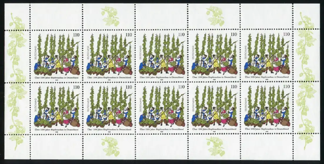 1999I Hopfenanbau - 10er-Bogen mit PLF I brauner Fleck im Hopfen, Feld 1, **