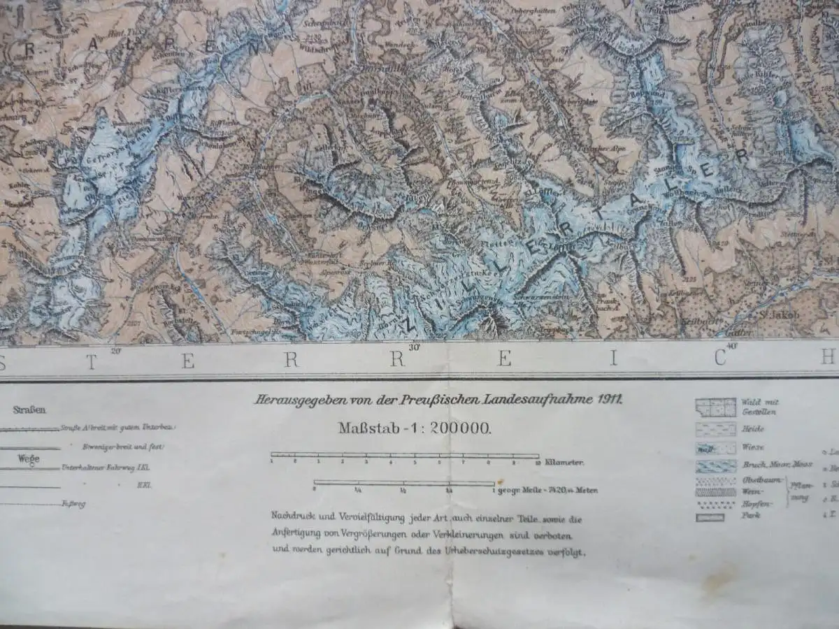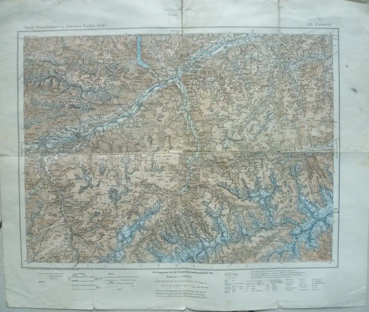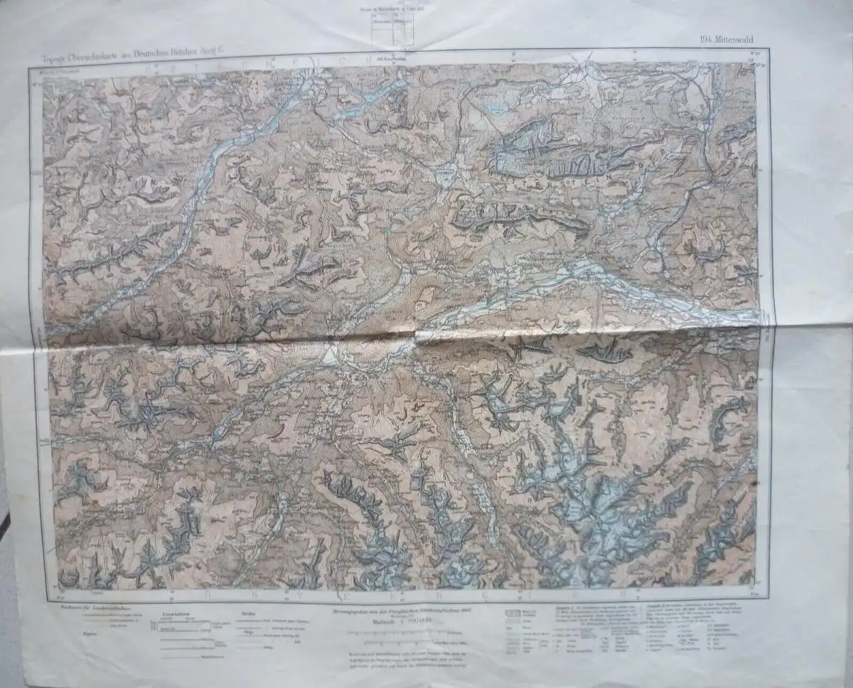 Topographische Übersichtskarte des Deutschen Reiches Ausg. C. Herausgegeben von der Preußischen Landesaufnahme 1906 / 1911. Maßstab 1:200000. Blätter 194 Mittenwald + 195 Karwendel . Karwendel leicht angeschmutzt und an den Faltstellen gering beschädigt. Gefaltet, gering fleckig. Gut erhalten.