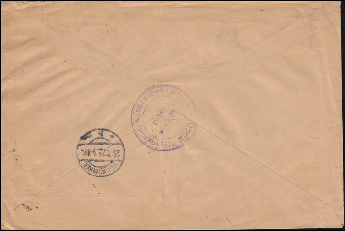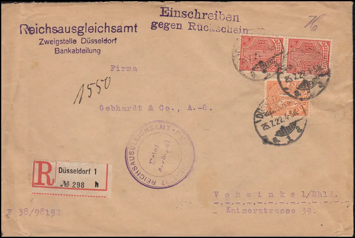 20+30 Dienstmarken R-Brief Reichsausgleichsamt DÜSSELDORF 25.7.22 nach Vohwinkel
