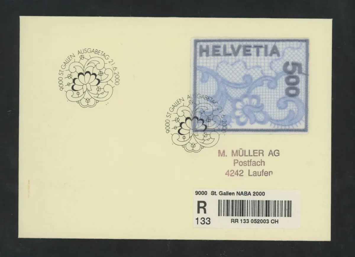 2000 SCHWEIZ, St. Galler Spitze einzeln auf offiziellem Umschlag, gebraucht Einheitskatalog Euro 15 Auslandskarton