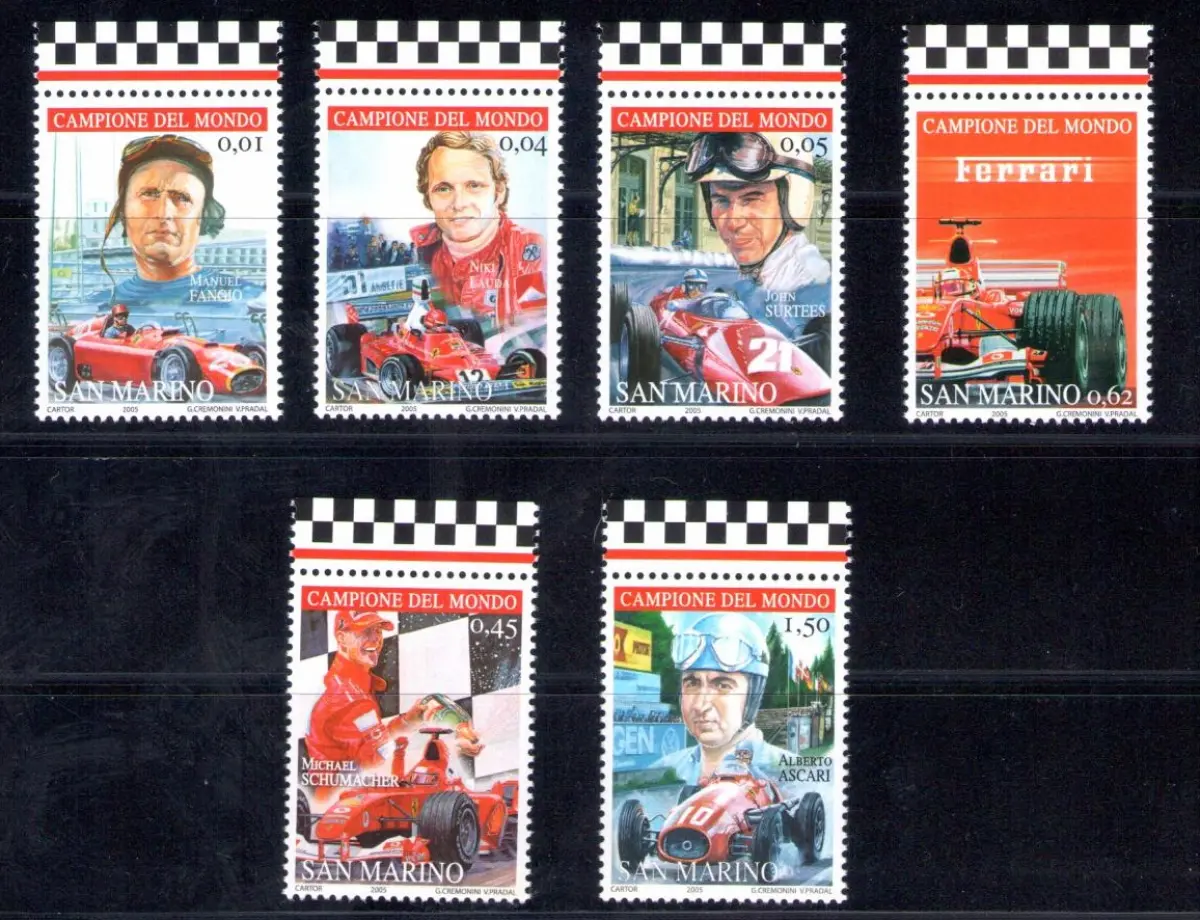 2005 San Marino, Hommage an Ferrari, Piloten Weltmeister mit Ferrari, Nr. 2025/2030, 6 Werte - postfrisch**