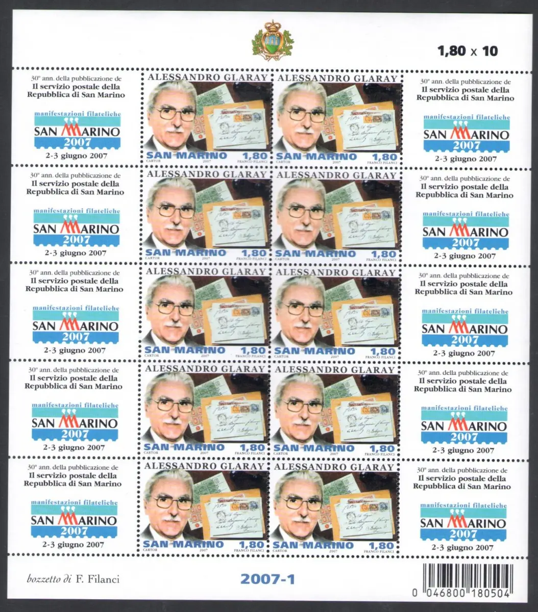 2007 San Marino, Glaray Experte für Philatelie und Postgeschichte Sanmarinese, Nr. 2128 - Kleinbogen 10 Werte mit Barcode, postfrisch **