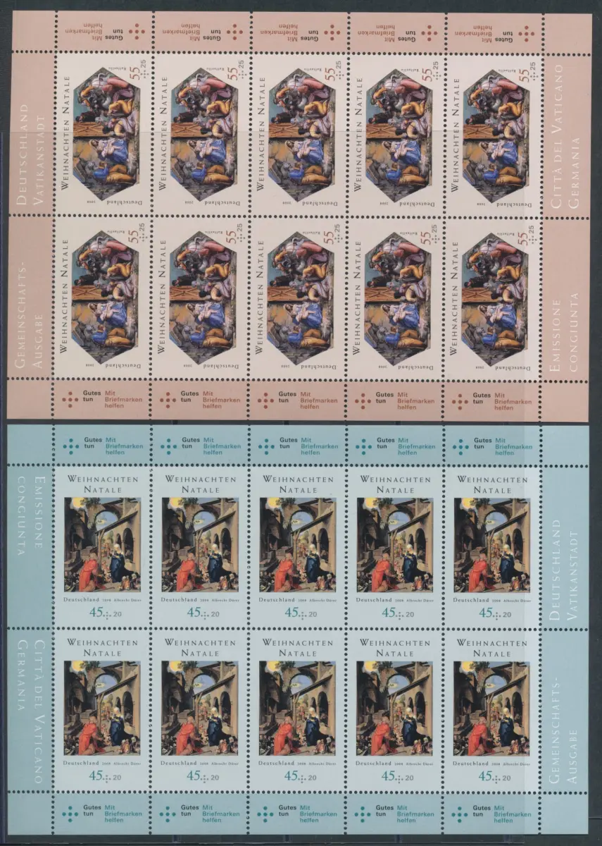 2008 Deutschland, Weihnachten - 2 Werte, 2 Miniblätter à 10, Gemeinschaftsausgabe mit Vatikan Nr. 1492/93 - postfrisch **