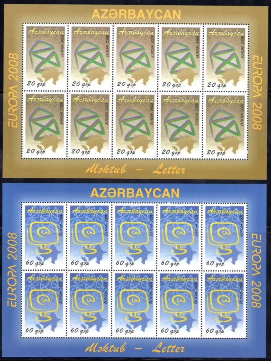 2008 EUROPA CEPT Aserbaidschan, 2 Miniblätter mit 10 Werten, La Lettera, MNH **, neu und perfekt, Vollgummi und original.