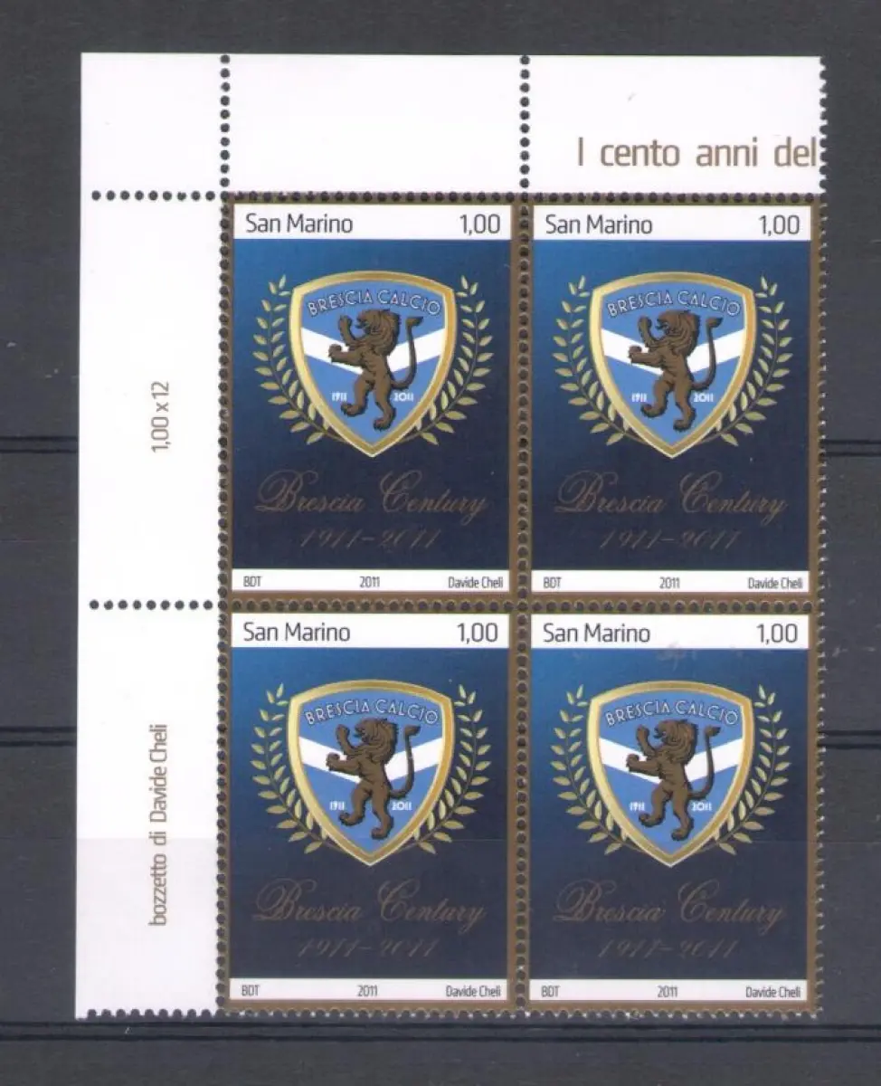 2011 San Marino, Hundertjahrfeier der Gründung der Gesellschaft Brescia, Nr. 2329, Quartina Winkel des linken Blattes, MNH ** es handelt sich um neue und perfekte Briefmarken, wie sie von der Republik San Marino ausgegeben wurden Einheitlicher Katalog Nr. MF 2329 Euro 120