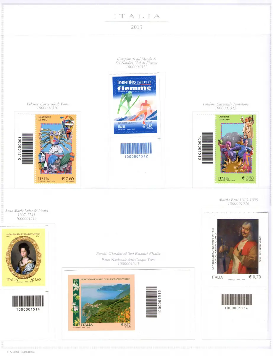 2013 Italienische Republik Barcodes kompletter Jahrgang 60 Werte + 1 Zettel (Weine) auf 14 Seeblättern