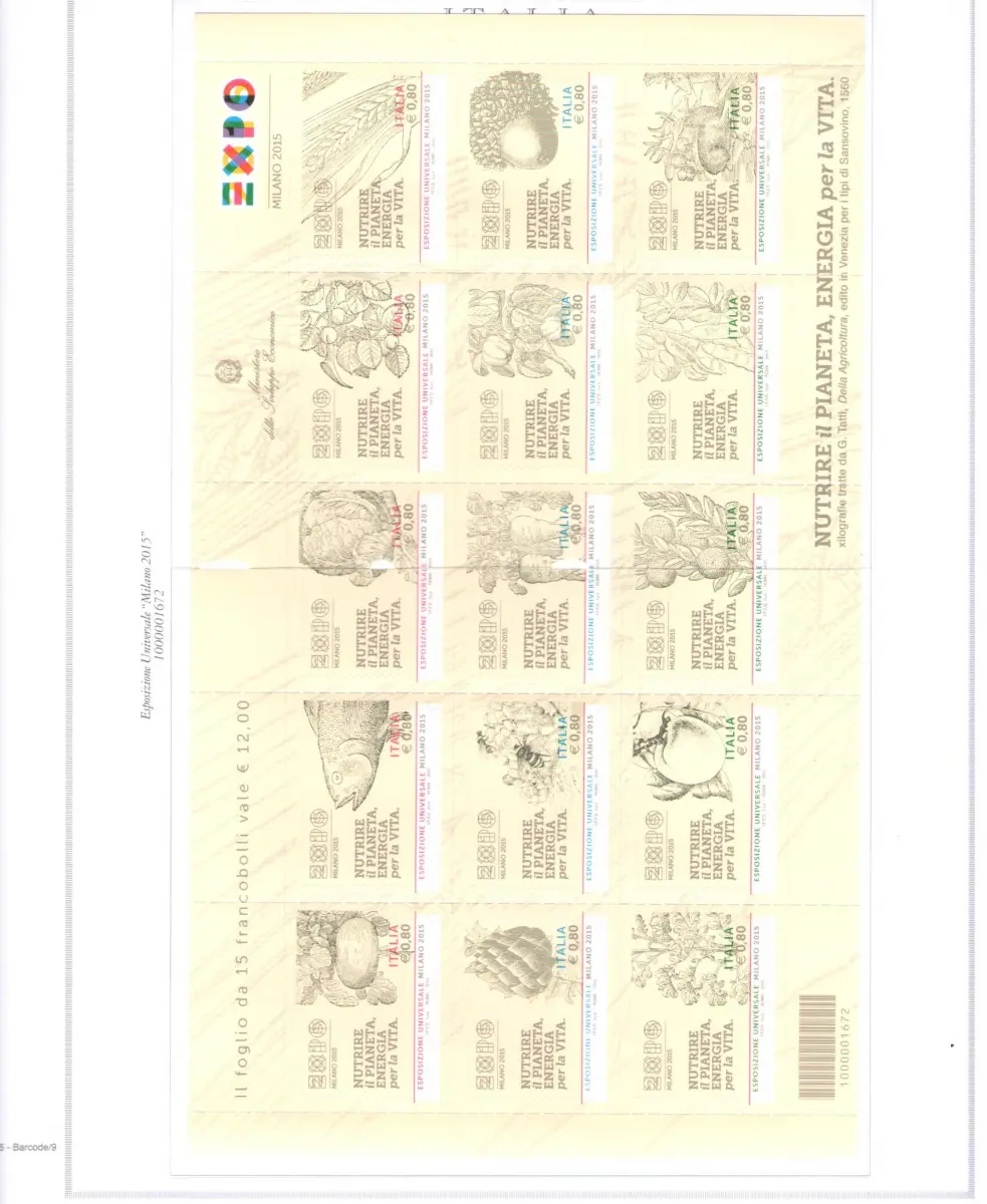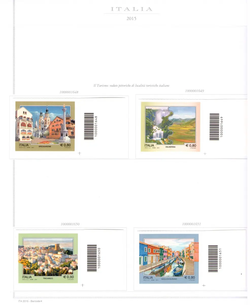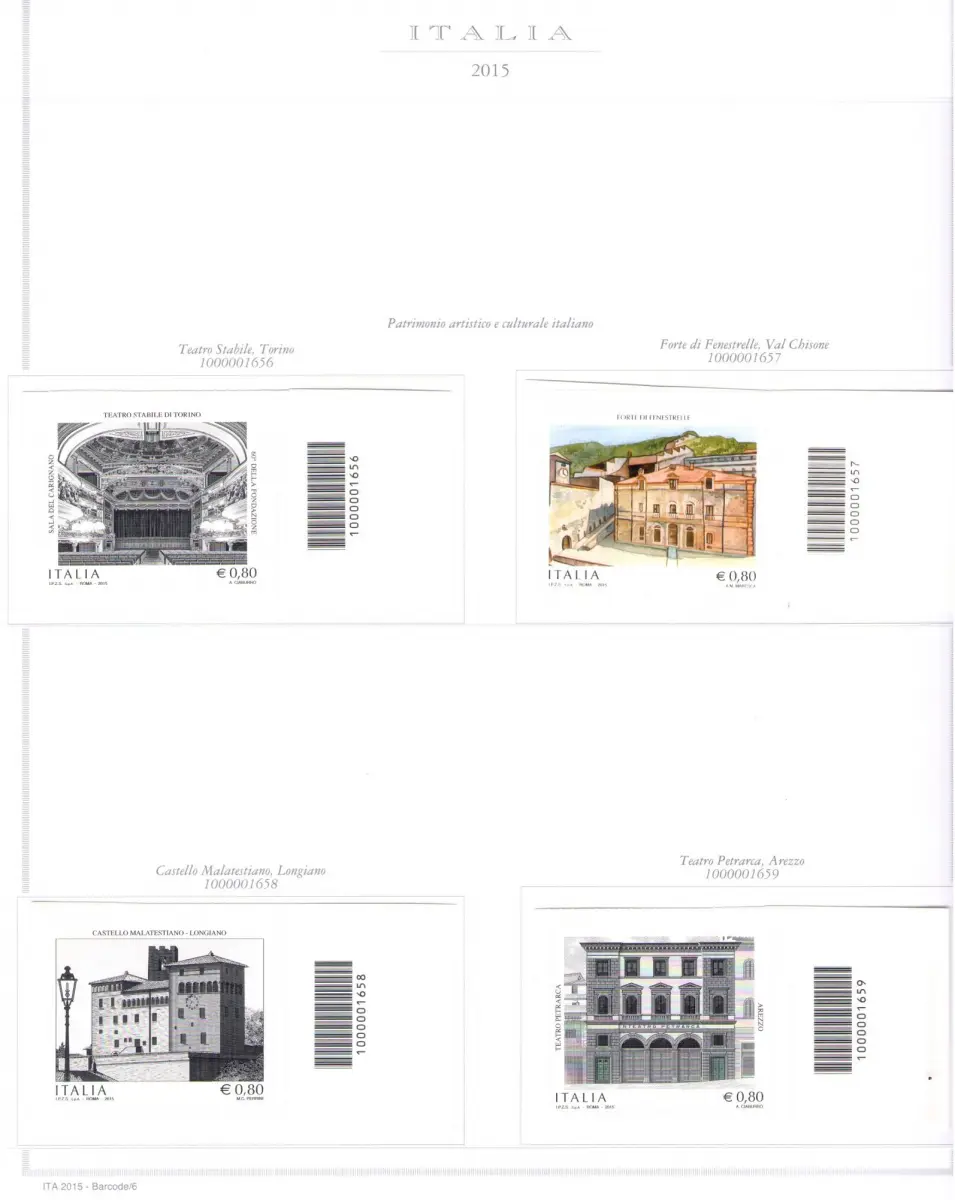 2015 Italienische Republik Barcodes Kompletter Jahrgang 78 Werte + 2 Zettel (Expo + Weine) auf 18 neuen Marineblättern, perfekte postfrisch ** Die Marineblätter stammen aus einer Sammlung, die von Privat zurückgezogen wurde, sind wie neu und kosten Euro 68,00 Nur Briefmarken mit Barcode sind auf der Großhandelsliste Euro 577,00 + 68,00 Blatt aufgeführt.