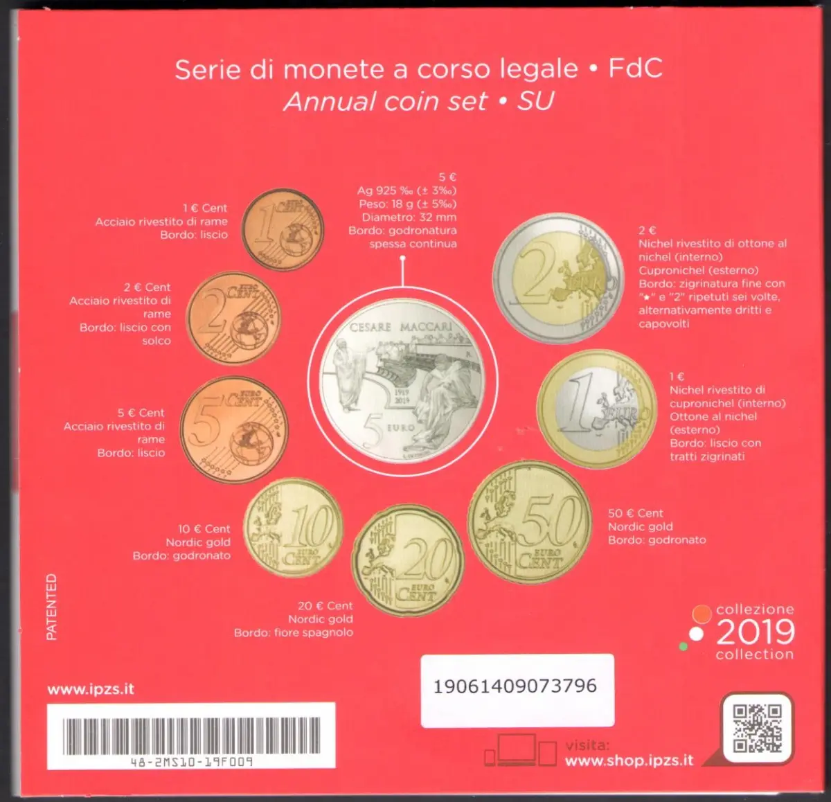 2019 Italien, gesetzliche Münzserie, Cesare Maccari, 9 Werte - FDC