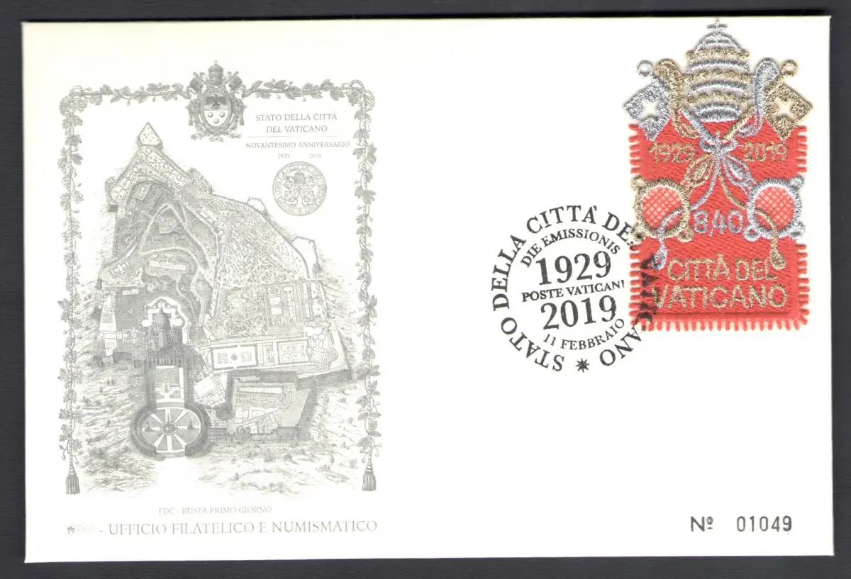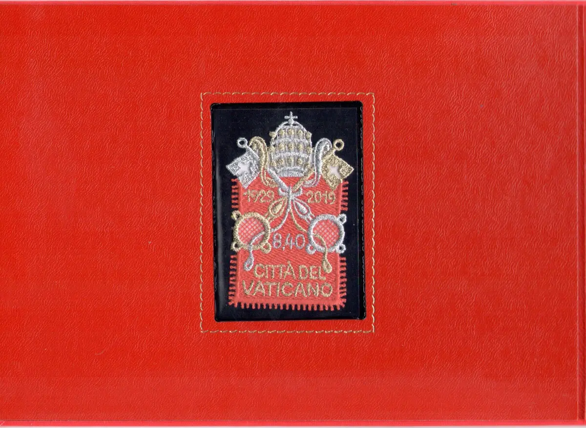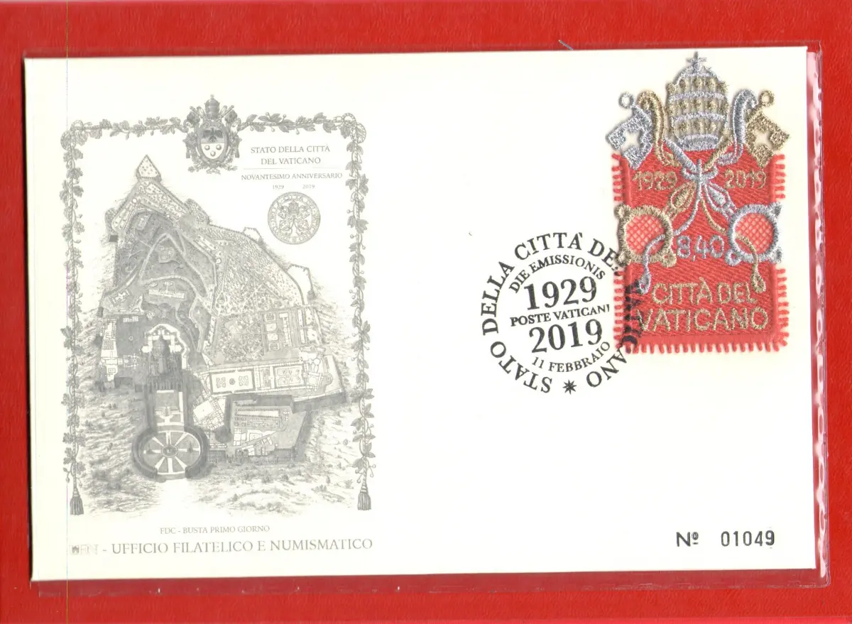 2019 Vatikan - Briefmarke + Stoffumschlag - Die Briefmarke EXISTIERT NUR IM FOLDER - 90. Gründung 1929-2019 MNH ** + Gebraucht Die rote Satinmappe enthält eine neue Briefmarke ab 8,40 Euro und eine gebrauchte Briefmarke auf Ersttagsumschlag 11-02-2019 (Der Umschlag ist nummeriert) Die Auflage beträgt 20.000 Ordner DER UMSCHLAG IST NUMMERIERT