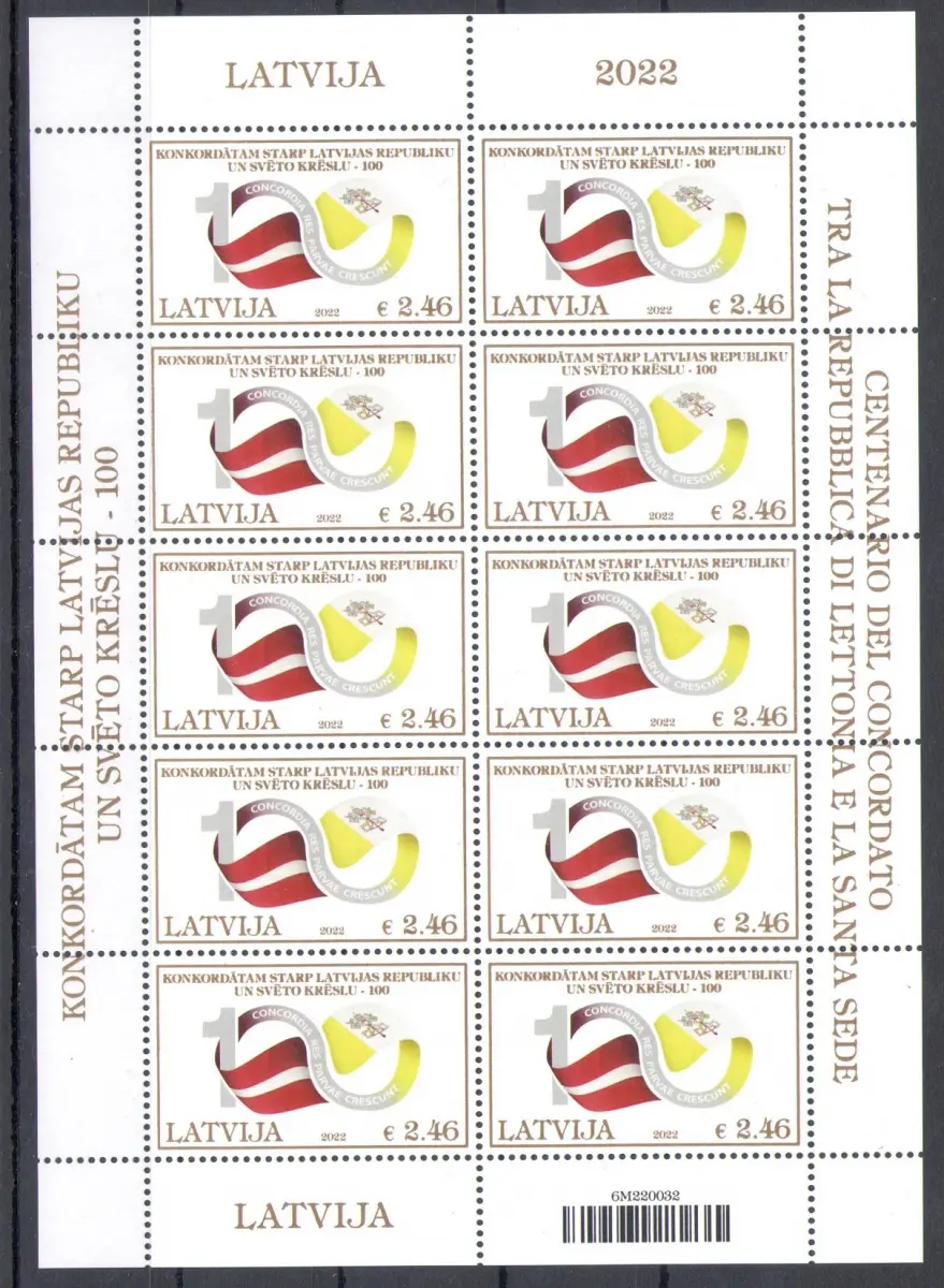 2022 Lettland - Hundertjahrfeier Konkordat - Gemeinsame Ausgabe mit dem Vatikan - 1 Minibogen mit 10 Werten - postfrisch **