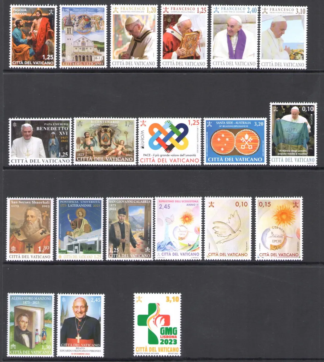 2023 Vatikan, 24 Werte + 6 Zettel + 1 Heft (ohne Abholung) postfrisch ** Alle von der Vatikanstadt im Laufe des Jahres 2023 ausgegebenen Gedenkmarken, Ohne die SELTENE Briefmarke zum Weltjugendtag, die am 16. Mai ausgegeben und am 17. Mai abgeholt wurde, neue und perfekte Briefmarken, Vollgummi und Original.