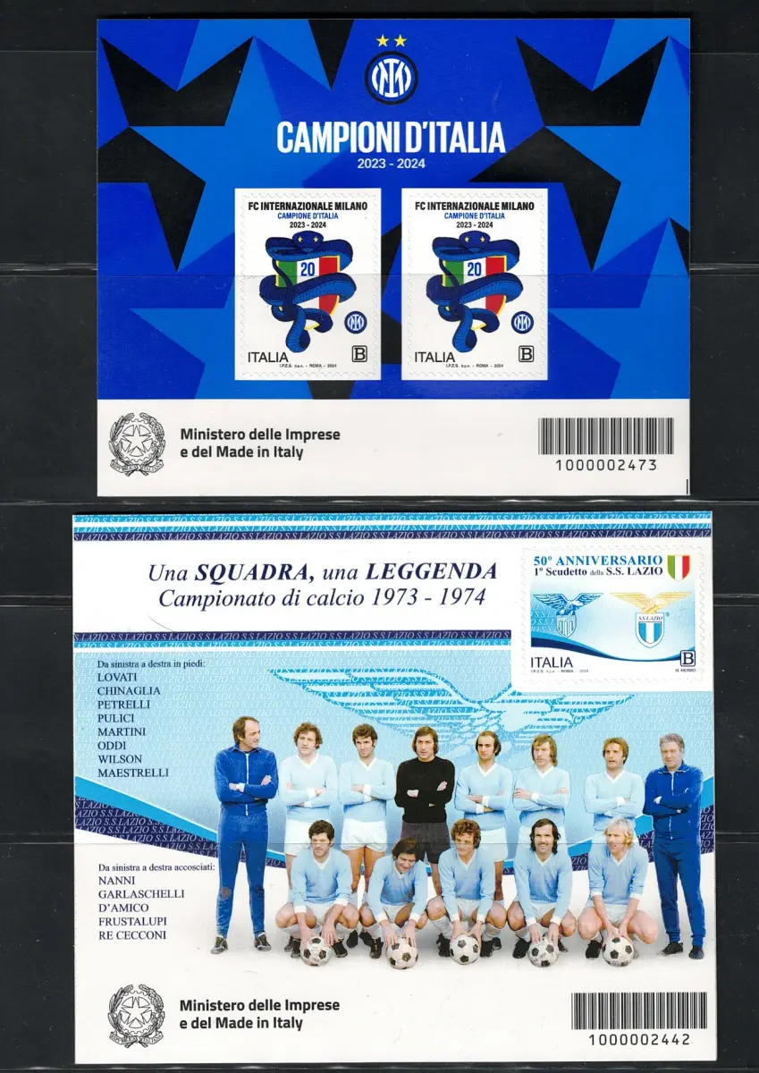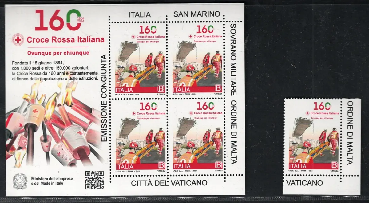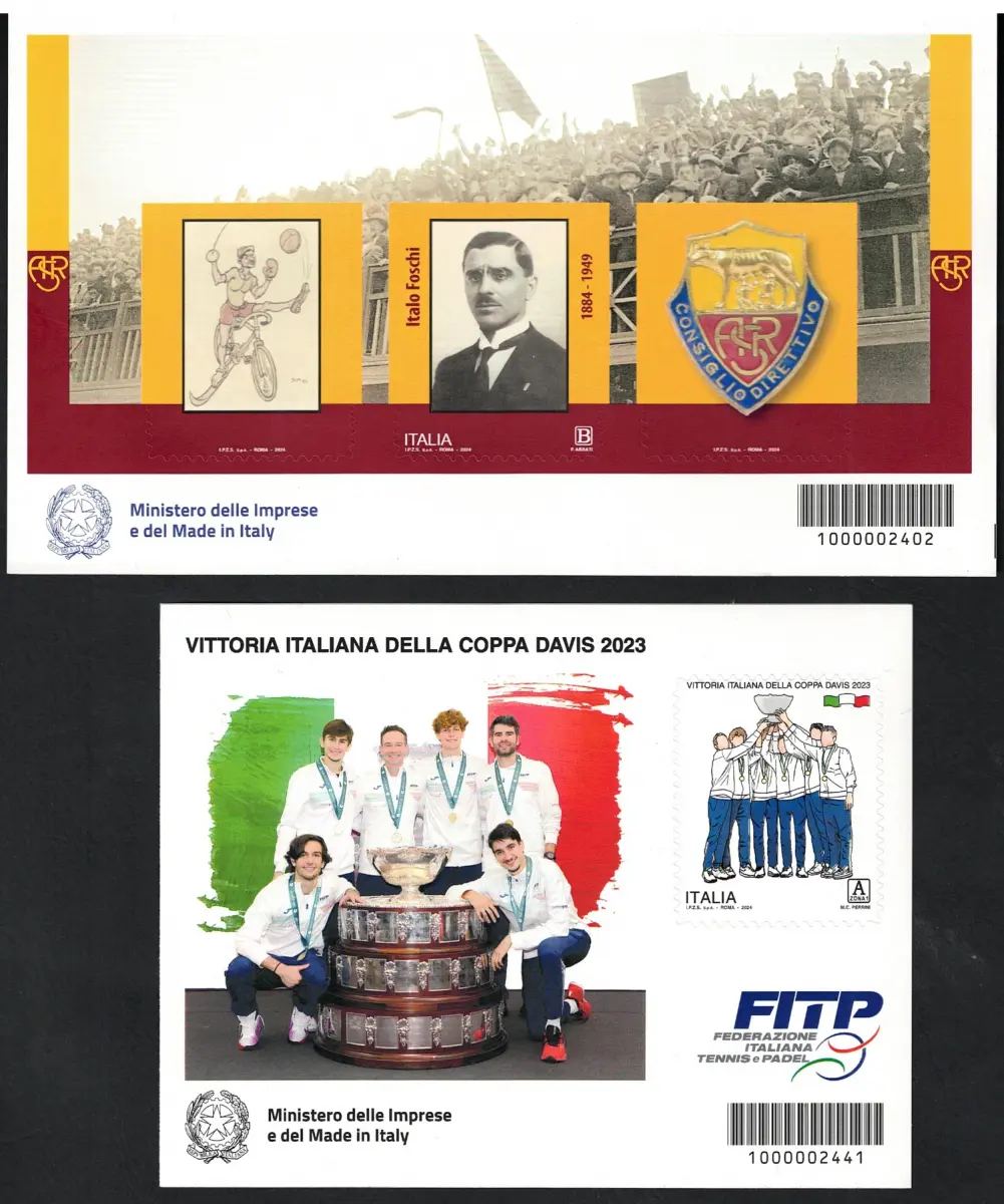 2024 Italien Republik, kompletter Jahrgang, 141 Werte + 8 unten beschriebene Zettel + 1 Kleinbogen Rotes Kreuz, postfrisch ** Die Zettel sind: Patentblatt zum Schutz der Erfindungen 250 Jahrestag der Finanzwache Italo Foschi 1884-1949 Vorstand Rom Italienischer Sieg des Davis-Cups 2023 Frankfurter Buchmesse 20 Jahre Magie - Winx 50 Jahre Erstes Abzeichen Lazio 2023-2024 Inter Campione d'Italia