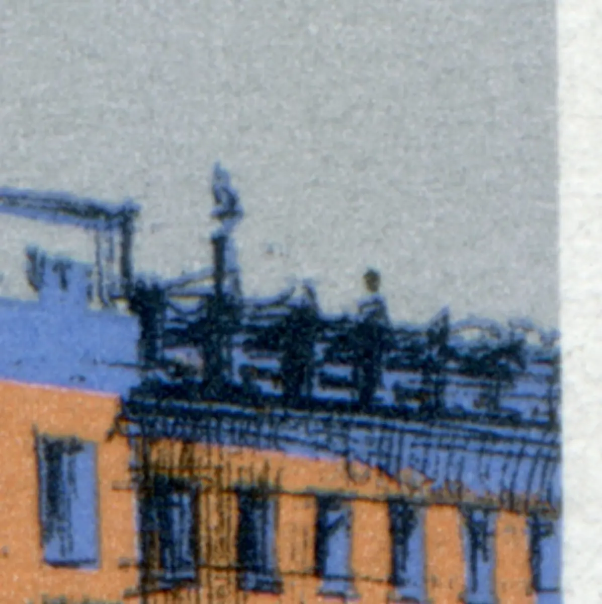Kleinbogen mit MICHEL-Plattenfehler I: zusätzliche Dachfigur ganz rechts, Feld 3.