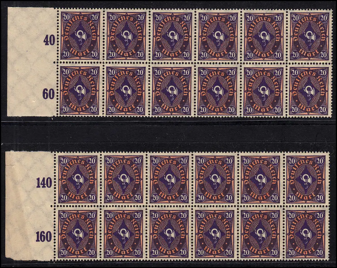 207I Posthorn 20 Mark mit 4mal PLF I auf 2 Bogenteilen, Felder 11,16,61,66, **