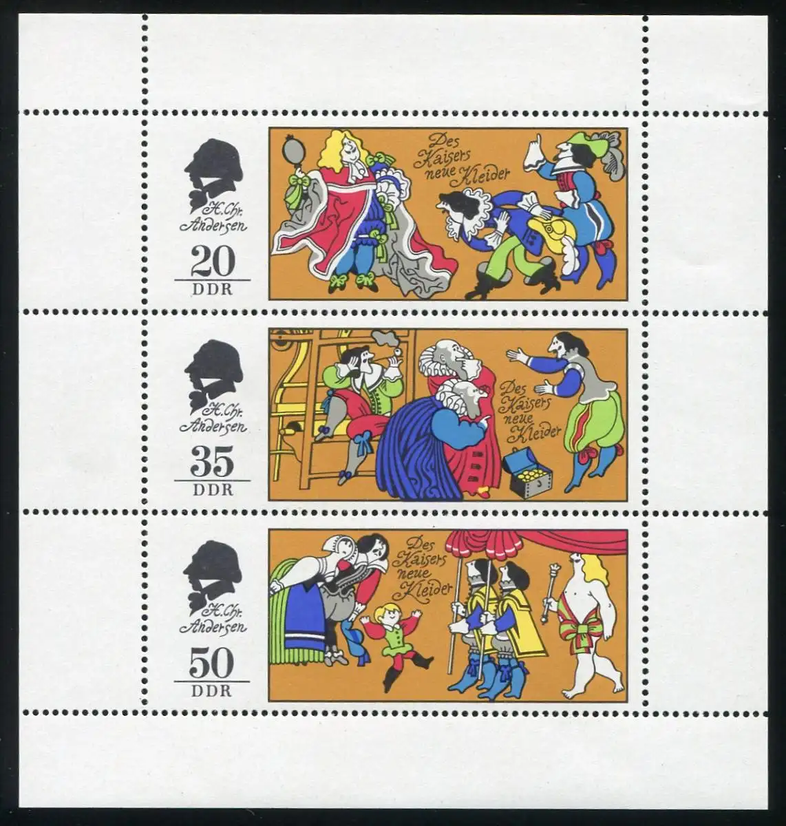 Des Kaisers neue Kleider Märchen-Kleinbogen unten nicht durchgezähnt, mit Plattenfehler: senkrechter schwarzer Hosenstrich (RICHTER 4 C III)